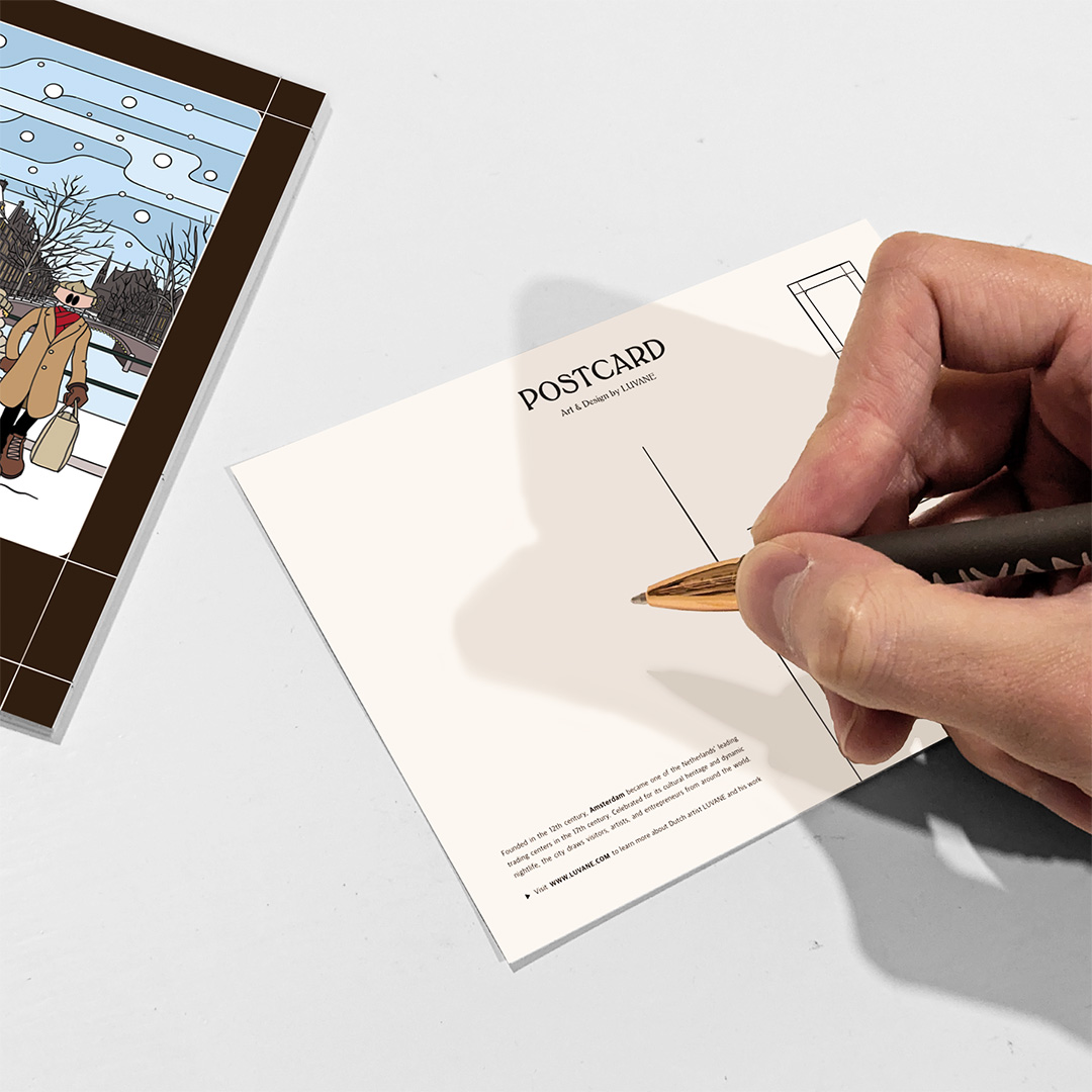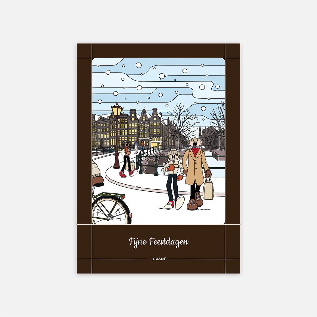 Pack of 10 coated silk greeting cards featuring a winter illustration of Amsterdam, the capital of the Netherlands. Founded in the 12th century, Amsterdam became one of the Netherlands’ leading trading centers in the 17th century. Celebrated for its cultural heritage and dynamic nightlife, the city draws visitors, artists, and entrepreneurs from around the world.