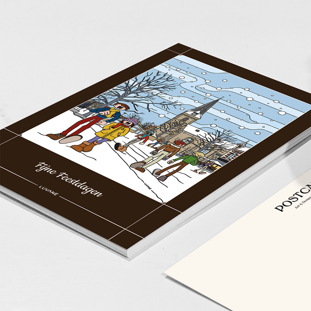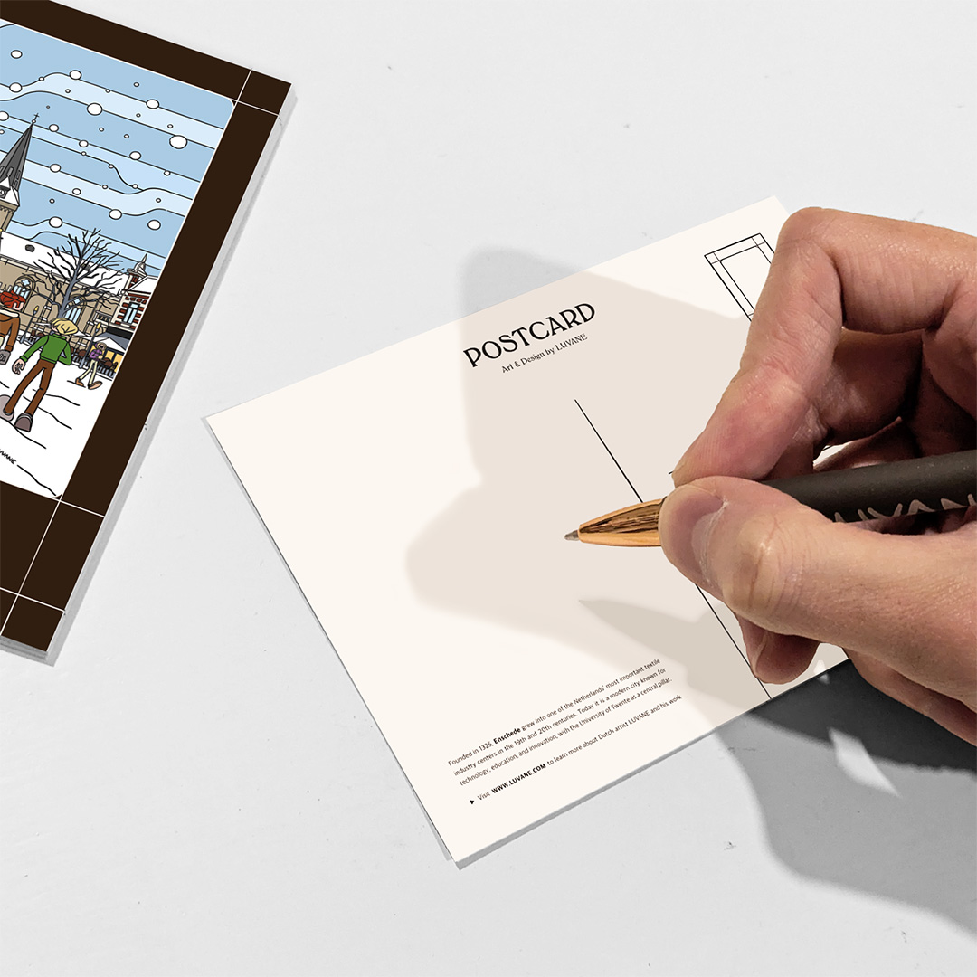 Pack of 10 coated silk greeting cards featuring a winter illustration of the centre of Dutch city Enschede. Founded in 1325, Enschede grew into one of the Netherlands’ most important textile industry hubs in the 19th and 20th centuries. Today it is a modern city known for technology, education, and innovation, with the University of Twente as a central pillar.