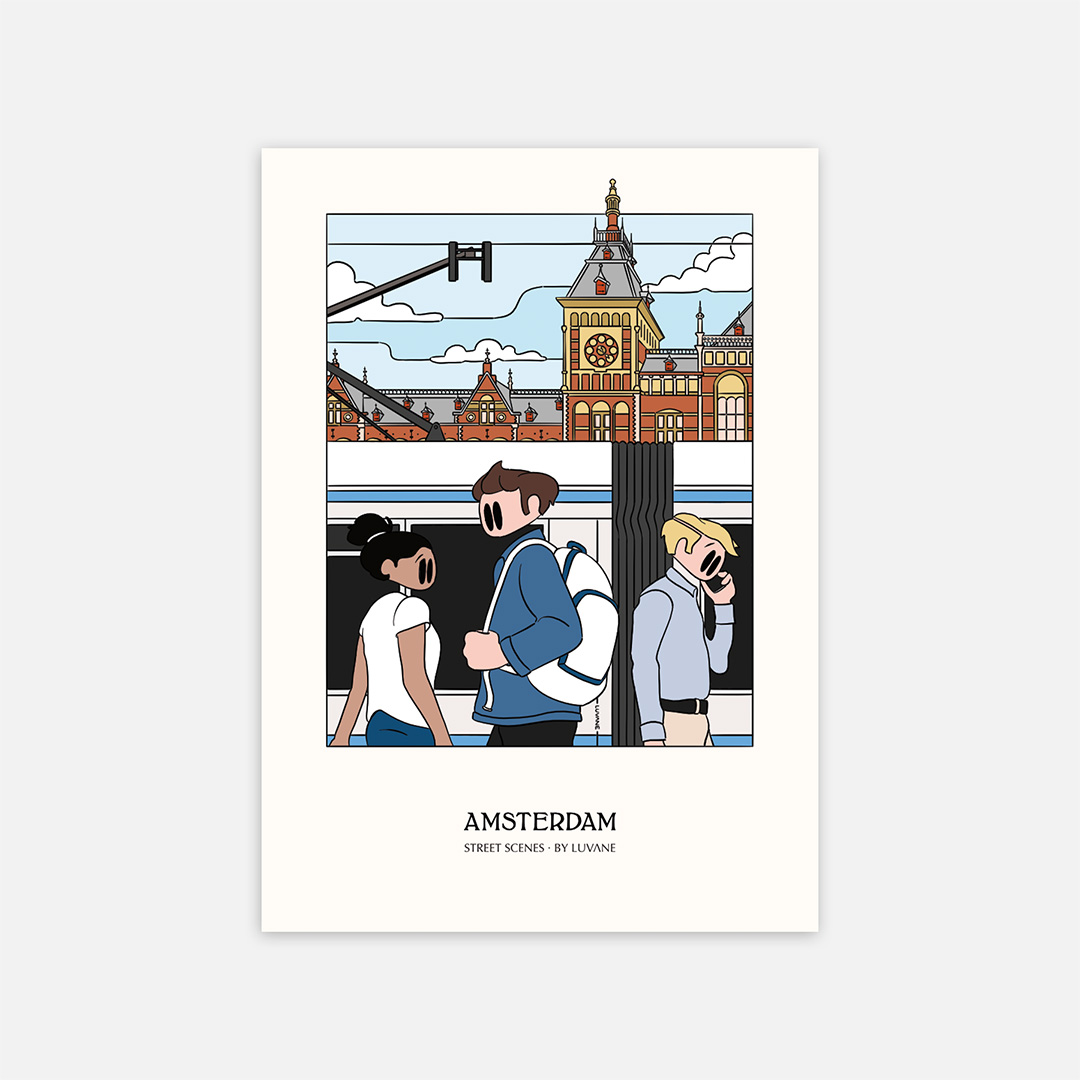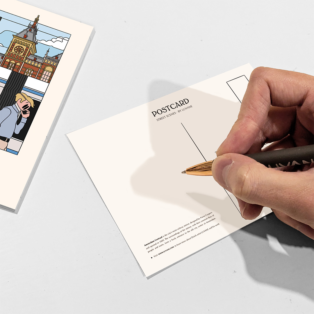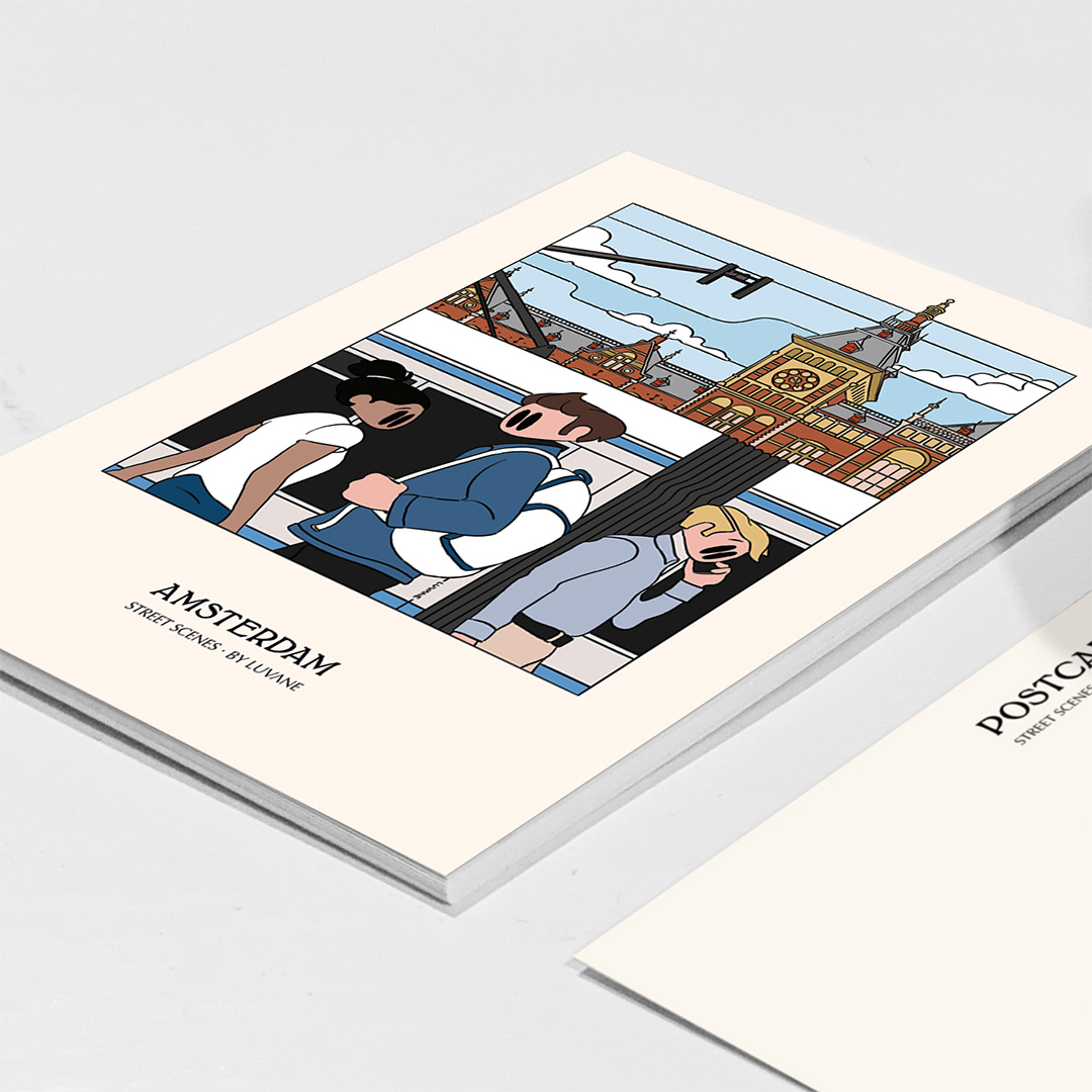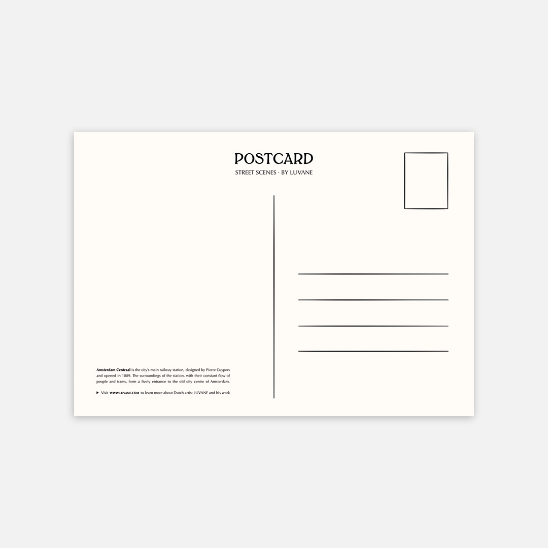 Pack of 10 coated silk postcards featuring a street scene from Amsterdam, with Amsterdam Centraal in the background. Amsterdam Centraal is the city’s main railway station, designed by Pierre Cuypers and opened in 1889. The surroundings of the station, with their constant flow of people and trams, form a lively entrance to the old city centre of Amsterdam.