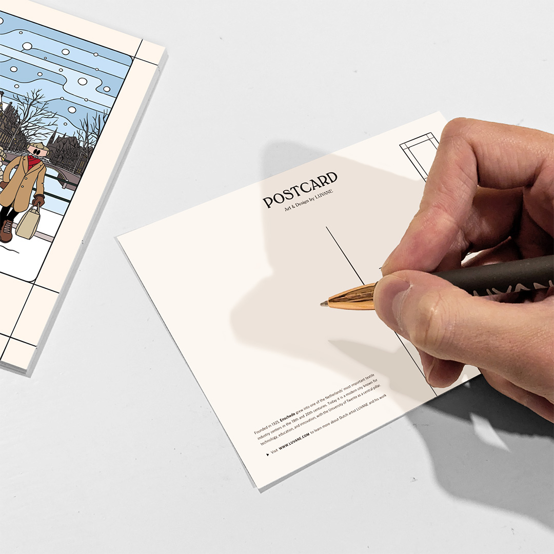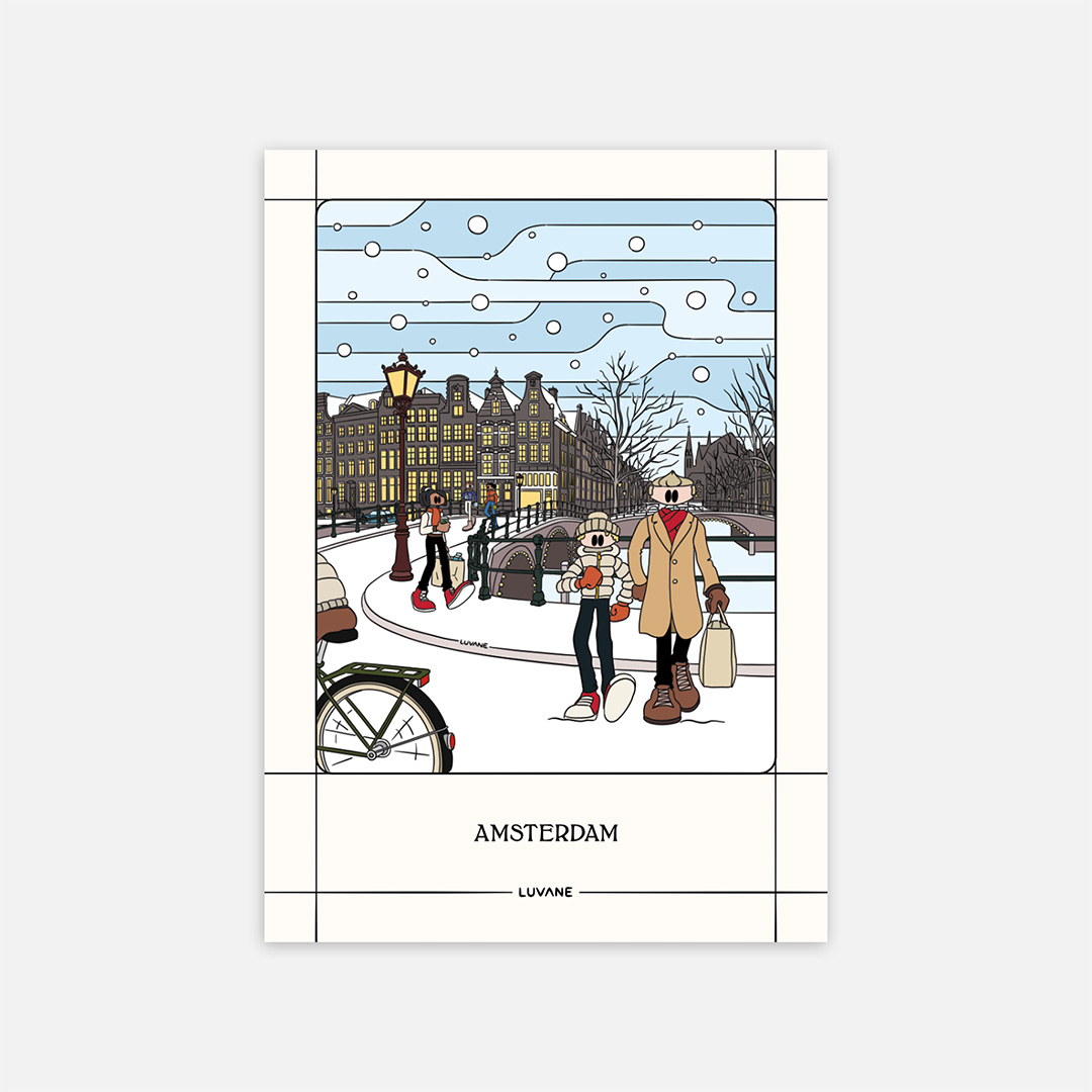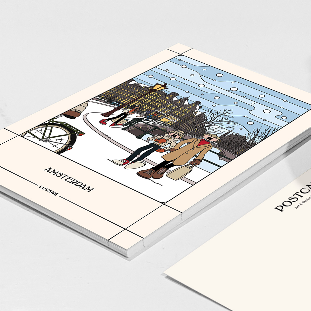 Pack of 10 coated silk postcards featuring a winter illustration of Amsterdam, the capital of the Netherlands. Founded in the 12th century, Amsterdam became one of the Netherlands’ leading trading centers in the 17th century. Celebrated for its cultural heritage and dynamic nightlife, the city draws visitors, artists, and entrepreneurs from around the world.