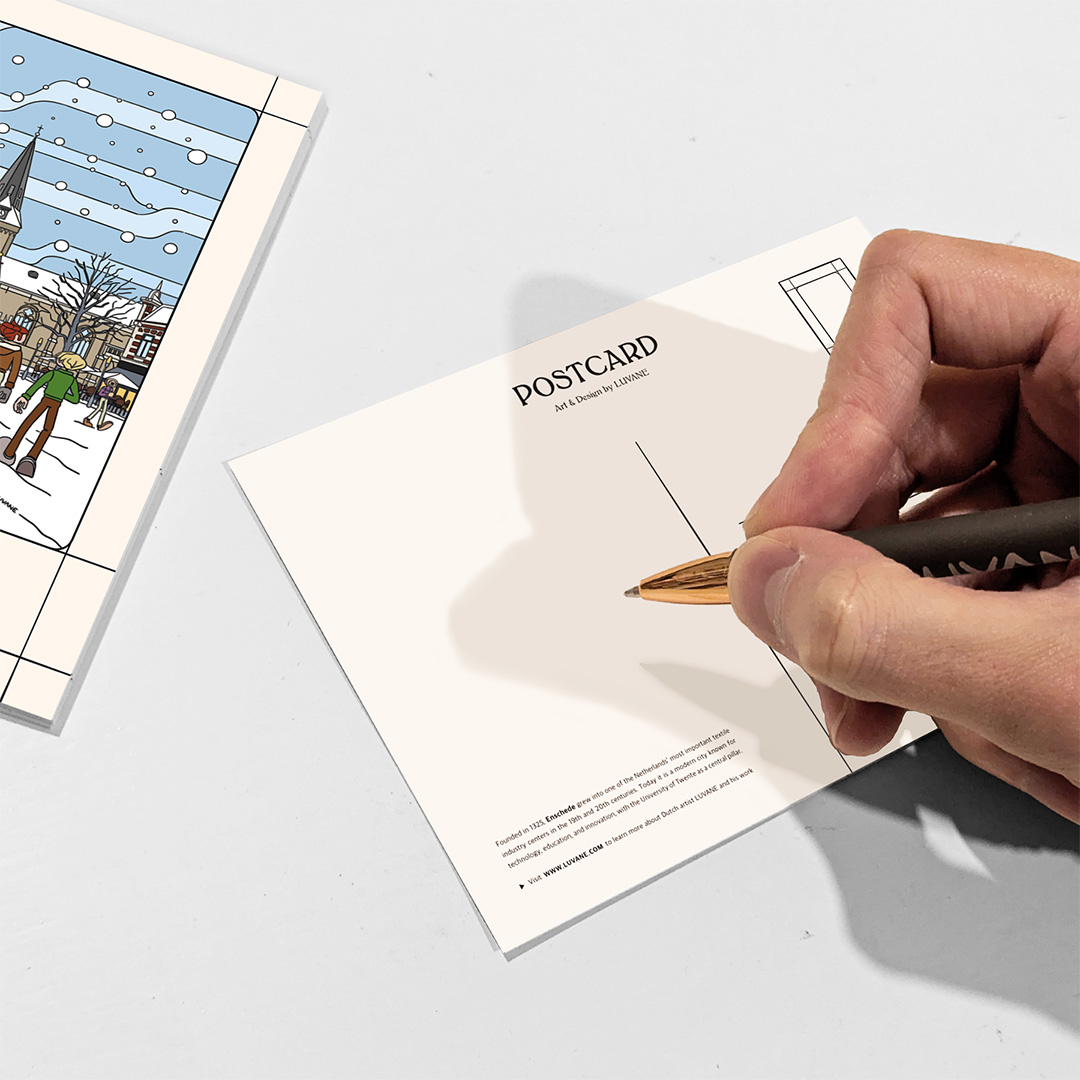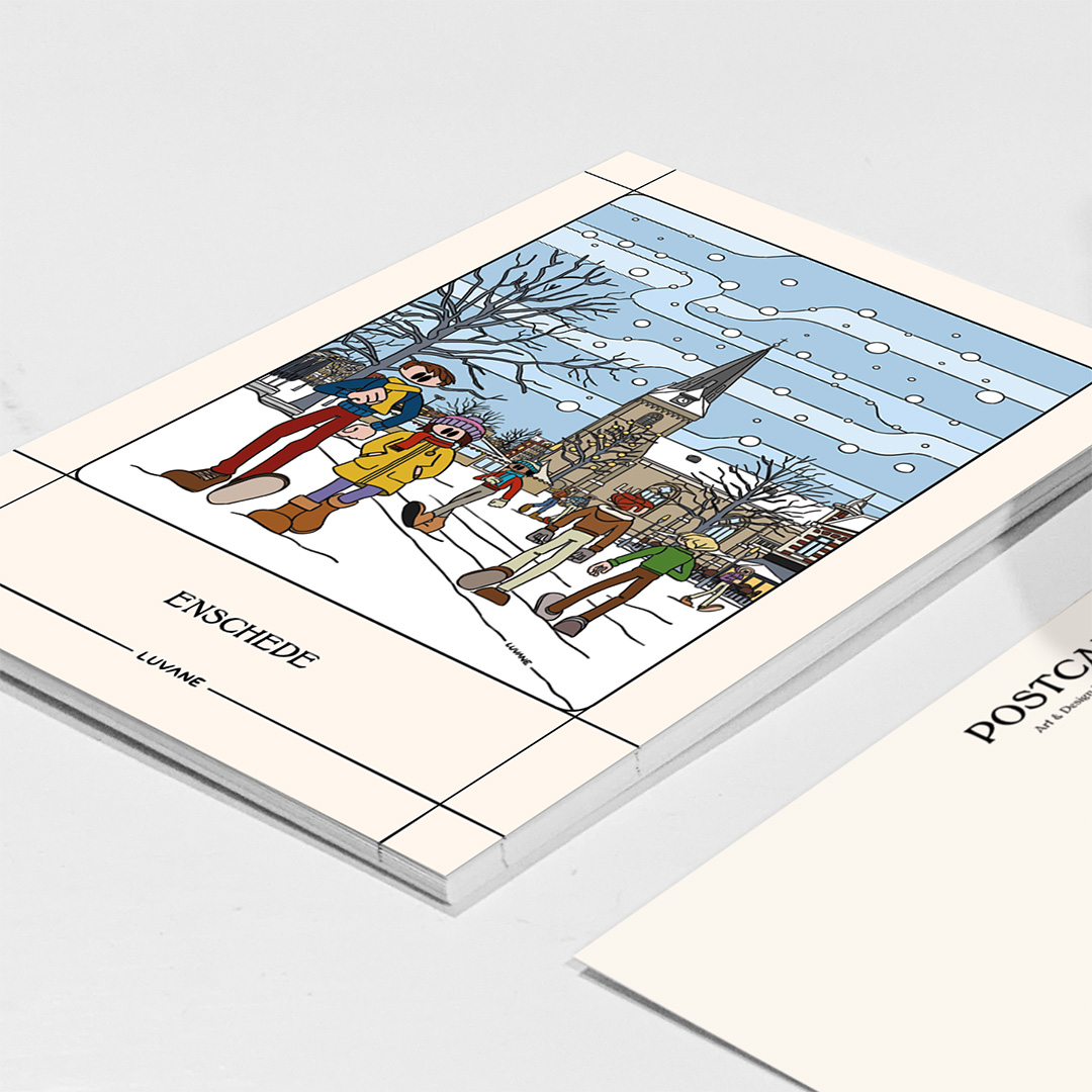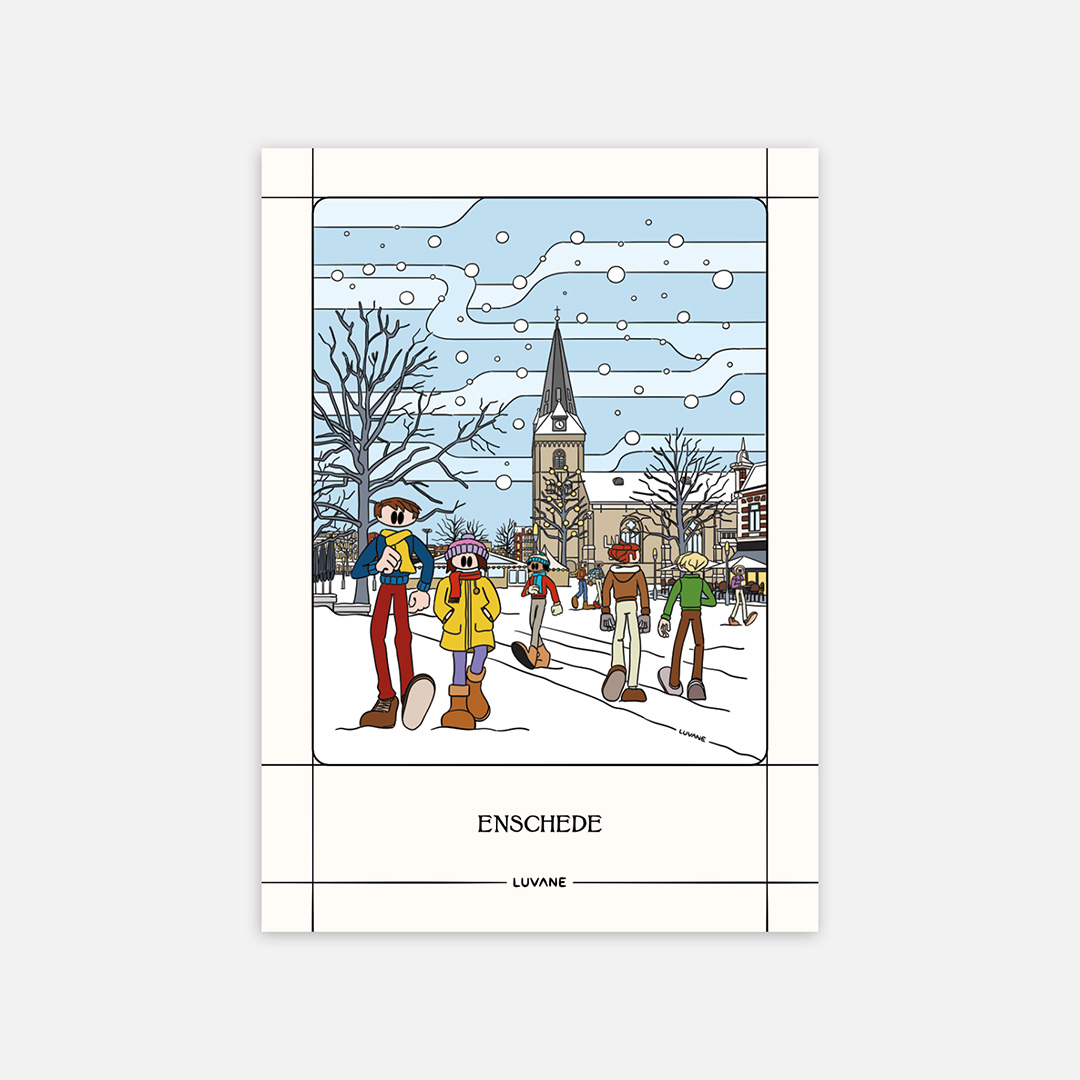Pack of 10 coated silk postcards featuring a winter illustration of the centre of Dutch city Enschede. Founded in 1325, Enschede grew into one of the Netherlands’ most important textile industry hubs in the 19th and 20th centuries. Today it is a modern city known for technology, education, and innovation, with the University of Twente as a central pillar.