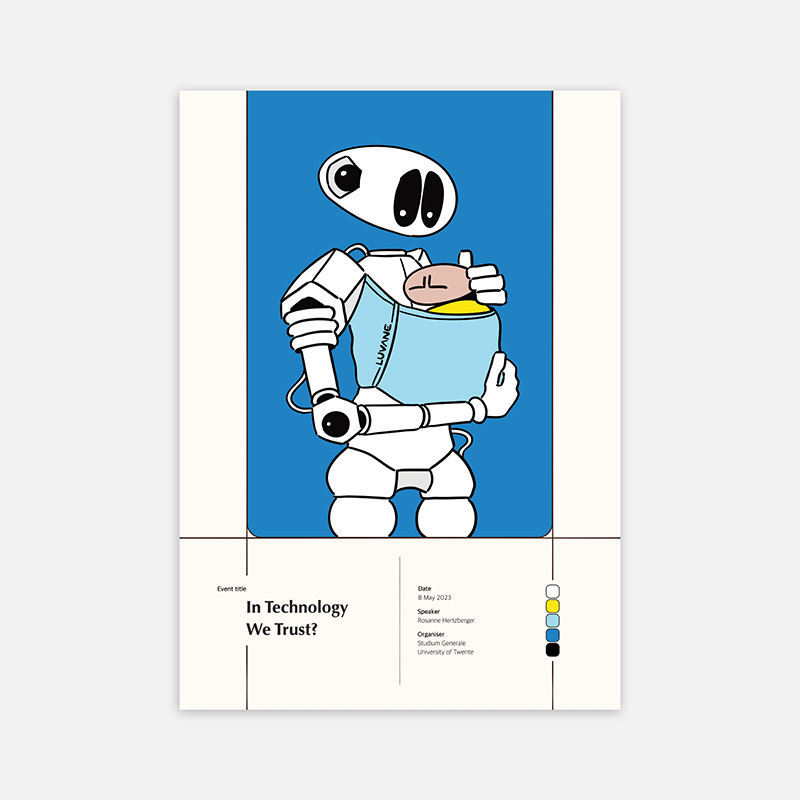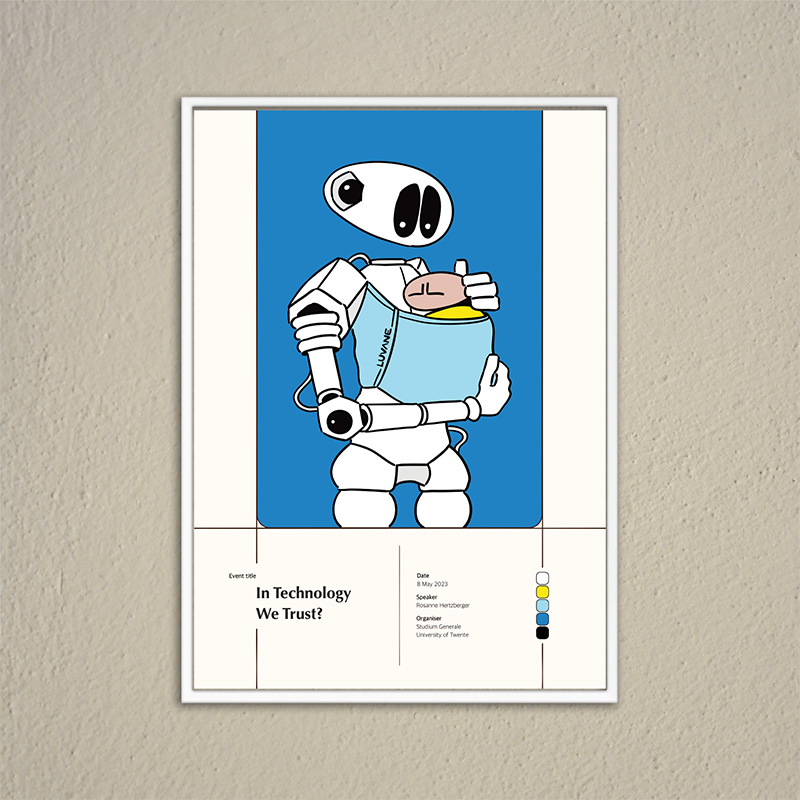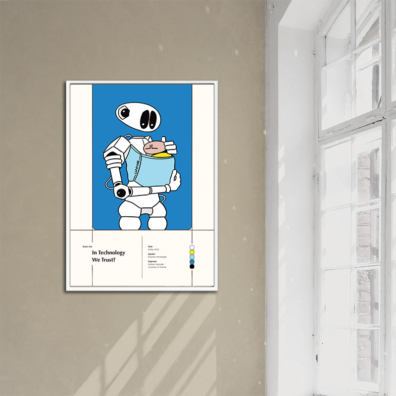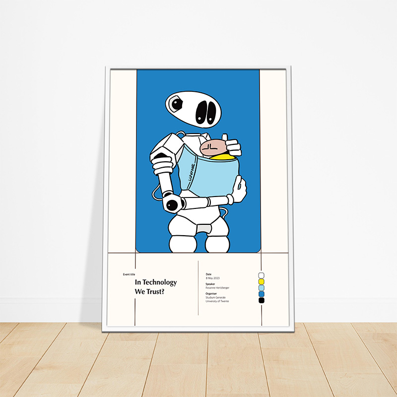 High-quality poster of LUVANE’s event illustration for the lecture ‘In Technology We Trust?’, featured in the spring 2023 programme of Studium Generale University of Twente in Enschede. Crafted from sturdy paper, making the poster look good with or without a frame.