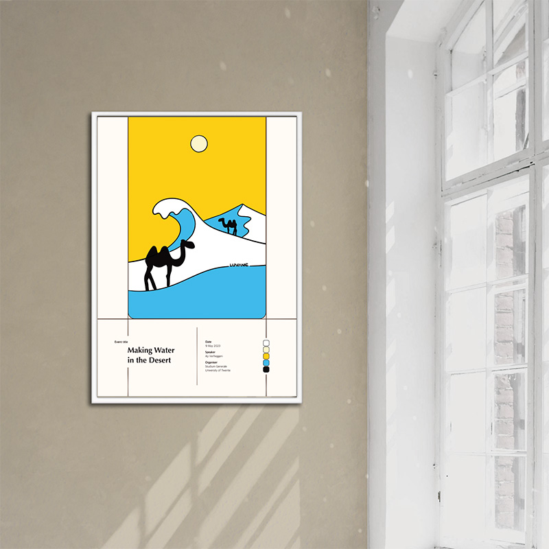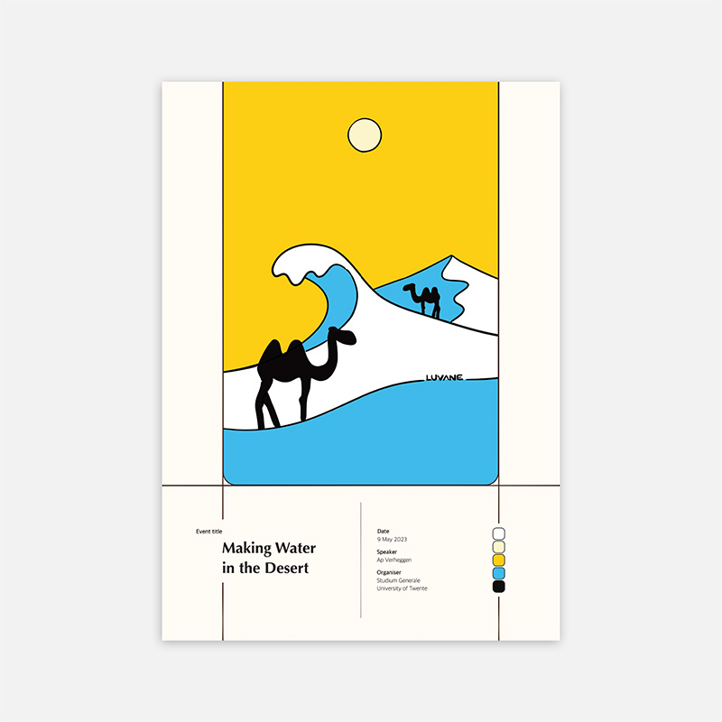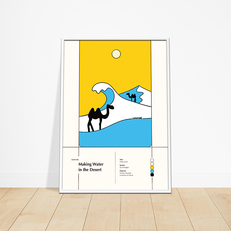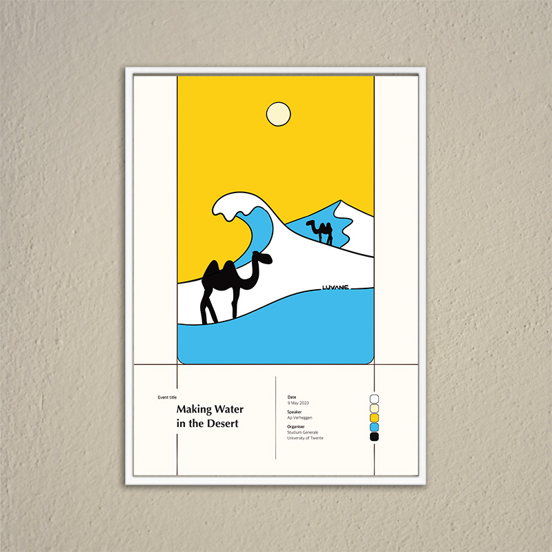 High-quality poster of LUVANE’s event illustration for the lecture ‘Making Water in the Desert’, featured in the spring 2023 programme of Studium Generale University of Twente in Enschede. Crafted from sturdy paper, making the poster look good with or without a frame.