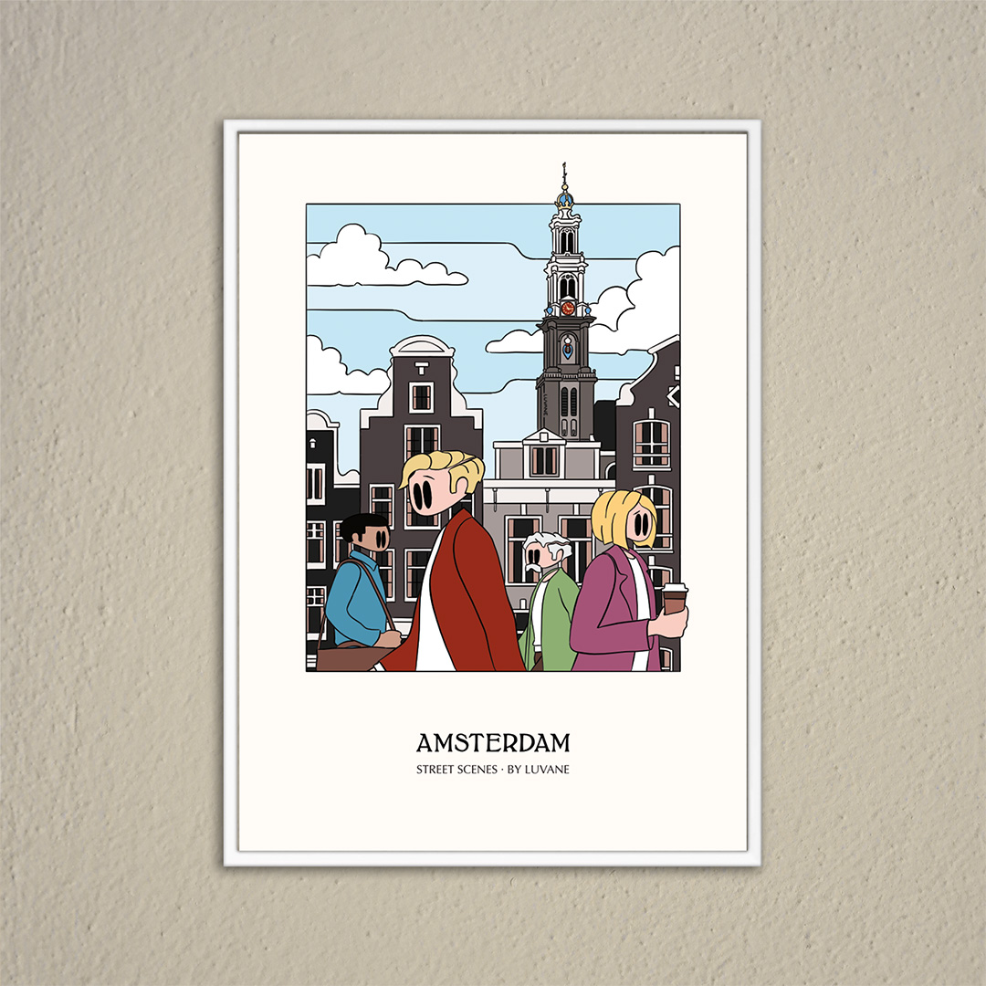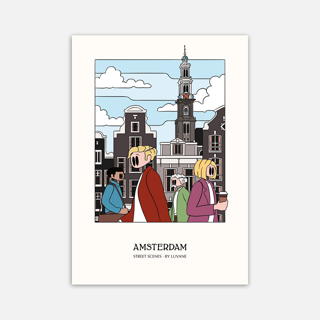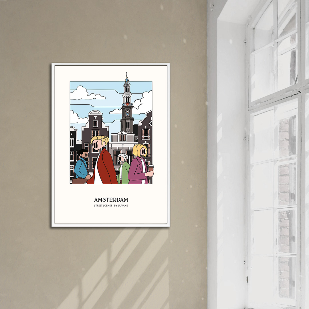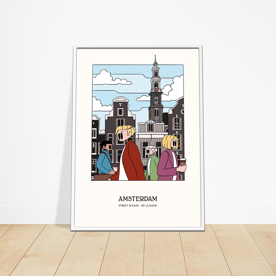 High-quality poster featuring an Amsterdam Street Scene, with the Westertoren in the background. The Westertoren is the iconic 85‑meter tower of the Westerkerk, completed in 1638 and long celebrated as the city’s tallest church tower. It can be seen and heard from far away by the citizens and visitors roaming the busy streets of Amsterdam.